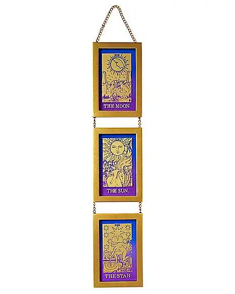 Looking for some cosmically-inspired style to add to your home? This Tarot 3-Tier Hanging Sign might just be in the cards for you. This eye-catching sign features bright, goldtone detailing of three of the Major Arcana that tarot readers will recognize from their deck: the Moon, the Sun, and the Star!